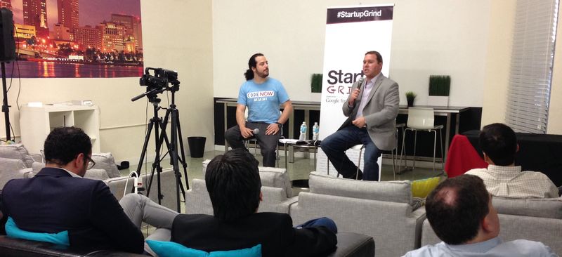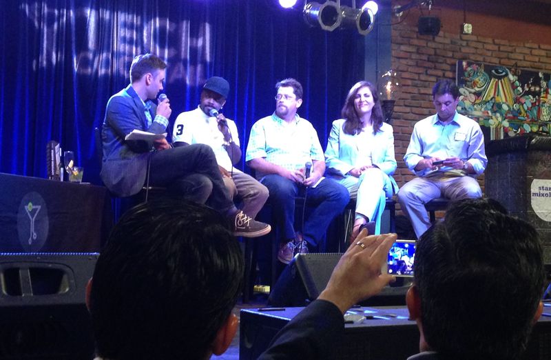 Frank Gruber, Jermaine Duri, Hugh MacLeod, Lori Anne Wardi and Matt Haggman at The Stage for Tech Cocktail's event. Above, Dan Cane with Jason Ibarra at Startup Grind at Venture Hive.