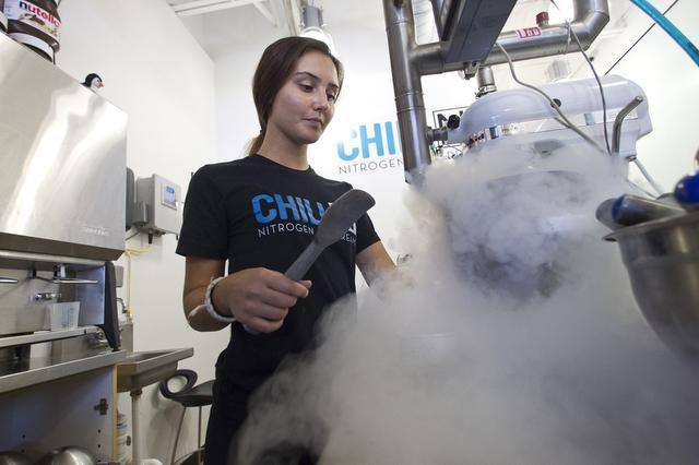 Although chefs have been using liquid nitrogen for years to enhance the dining experience, there remains a sense of alchemy when the folks at Chill-N create a dish of ice cream on the spot in a puff of smoke. Actually, it’s more like fog, as little sprays of liquid nitrogen — with a cool temperature of -320 degrees Fahrenheit — fast-freeze each bowl of basic liquid ice cream mix that has been individually flavored. The result is a rich ice cream that has the taste and consistency of gelato.
