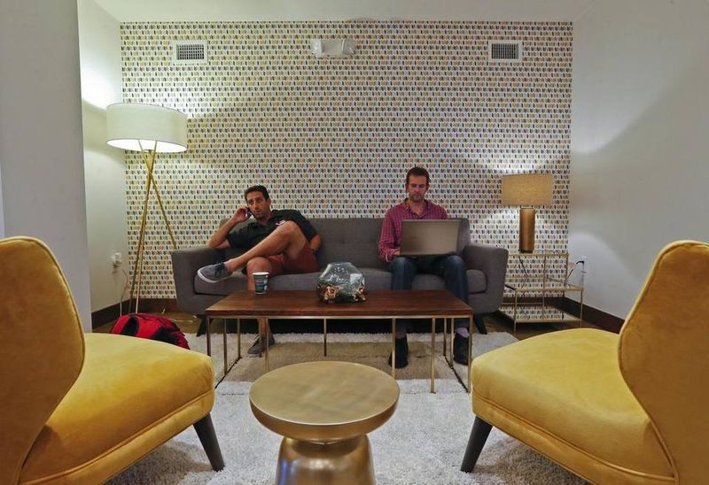 Jonathan Strauss and Steven Quayle work at Buro MiMo, a new co-working space opening up in northeast Miami. Quayle of 3Floorsup is helping Strauss, who owns Skateboard Supercross, with some work on his digital platform. Buro MiMo has a retro-chic design to reflect its historic MiMo neighborhood of ‘50s architecture. Photo by Al Diaz/Miami Herald. FIND A PHOTO GALLERY OF SOUTH FLORIDA CO-WORKING SPACES HERE.