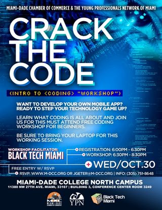 Learn what coding is all about at the FREE Intro to Coding workshop for beginners presented by the Miami-Dade Chamber of Commerce and the Young Professionals Network of Miami.
