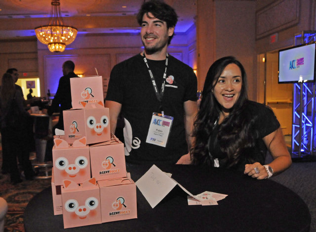Founders Pablo Ambram and Maritza Lanas of AgentPiggy talk to investors in the "Hot Zone," an online piggy bank that educates kids to make better financial decisions in their lives. AgentPiggy, of Chile, was one of the presenting companies. Photo by Marice Cohn Band of The Miami Herald.