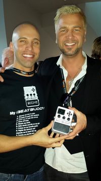 Pictured: David Packouz showed Ulf Ekberg, serial entrepreneur and founding member of Ace of Base, the BeatBuddy earlier this month at SIME MIA, where Ekberg was a speaker, and Ekberg liked it. Above, photos of the product and the T-shirt that is one of the giveaways in the Indiegogo campaign. Photos provided by BeatBuddy.