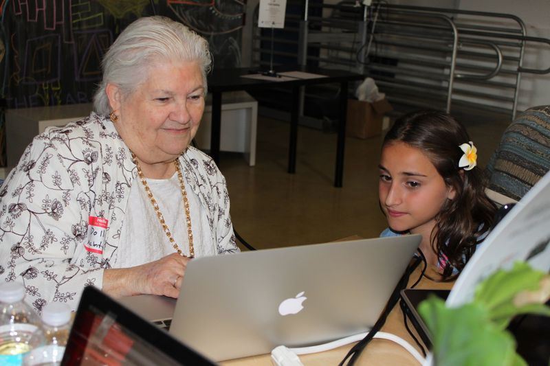 LEARNING CODE: Dolly MacIntyre, a historic preservation official with Dade Heritage Trust, writes code for a Code for America Write-a-thon with Catherine Maunder, a fifth grader, at The LAB Miami's Hack for Change event. (THEO KARANTSALIS/FOR THE MIAMI HERALD)
