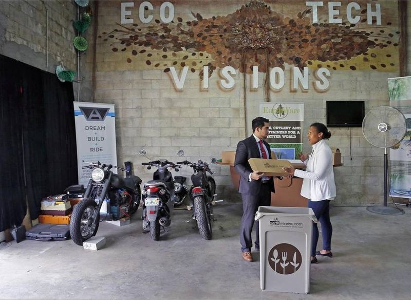 Michael Caballero, CEO of Earthware, left, and Pandwe A. Gibson, CEO/executive director at EcoTech Visions are photographed at the incubator helping 25 green product companies in the Miami-Dade area. Earthware makes sustainable cutlery. Carl Juste MIAMI HERALD STAFF