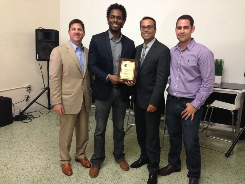 Below: from left, Kevin Levy of Gunster and GMCC, winner Karl Morris, Ralph MacNamara of Kaufman Rossin and GMCC; and runner-up Jay Prendes.