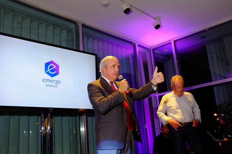 Manny Medina, founder of eMerge Americas, and Miami-Dade Mayor Carlos Gimenez (pictured above) kicked off a celebration at YoungArts on Wednesday night for the next eMerge Americas, which included a look back at the inaugural year that attracted 6,000 people and a peek at what’s ahead for year two.