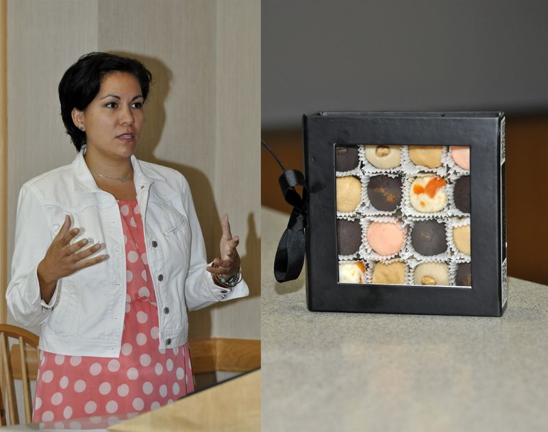 Lucy Calamari, who won the Grand Prize in the alumni category for Lucky Lucy’s Chocolates, presents to the judges.