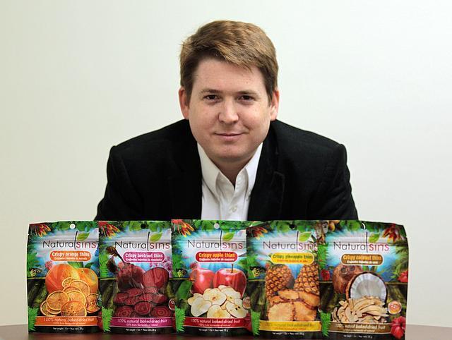 Andres I. Domínguez Dillon displays bags of Natural Sins fruit chips. The company sells them to locations in Central America, the U.S., Canada and Japan. PEDRO PORTAL / EL Nuevo Herald