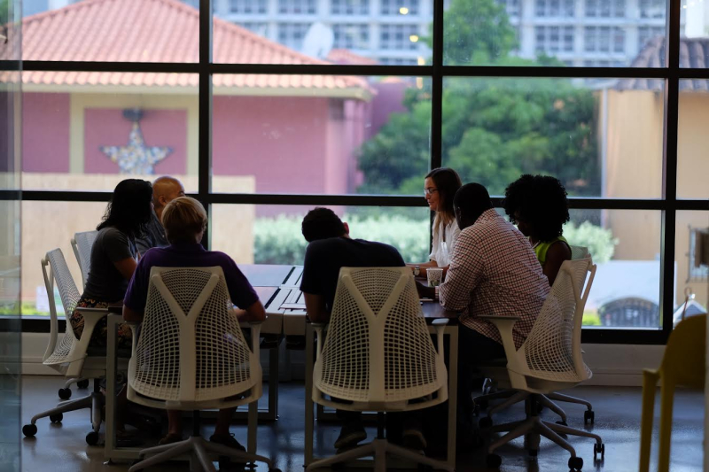 Photos were taken during Startupbootcamp's Selection Days in Miami July 30 and 31 at Building.co. At top, Christian Seale addresses crowd; above, one of the teams meets with selection panelists.