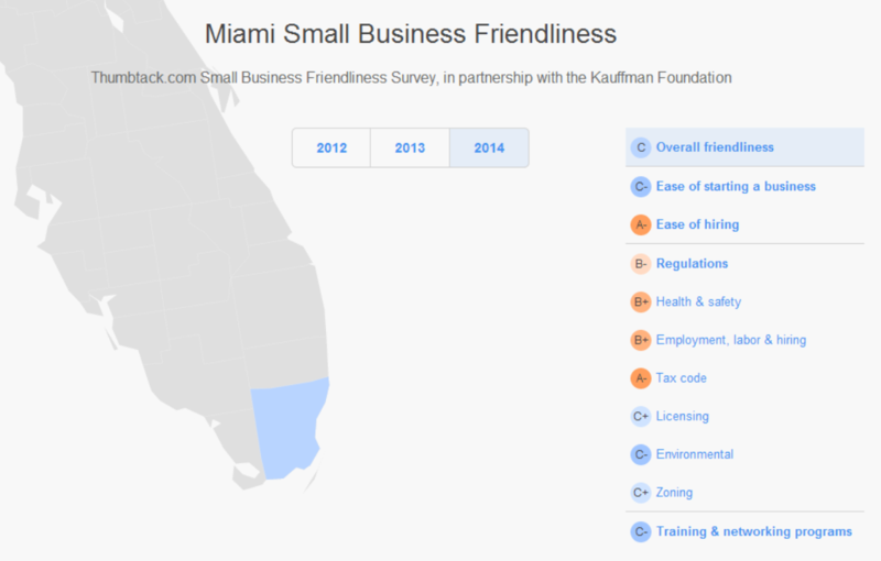South Florida's small business owners see plenty of room for improvement in their local government, according to a survey released by Thumbtack.com, in partnership with the Kauffman Foundation. Miami earned a C for overall friendliness. Its neighbors to the north? Fort Lauderdale received a D+ and West Palm Beach earned an A-.