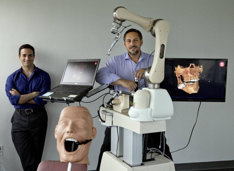 Alon Mozes, left, and Juan Salcedo started the healthcare robotics company Neocis. They are shown with an early version of Neocis’ robotic guidance system for the fast-growing dental implant market, which received FDA clearance and is now being marketed. Both co-founders worked together at Mako Surgical before founding Neocis. November 2015 photo by Patrick Farrell/Miami Herald.
