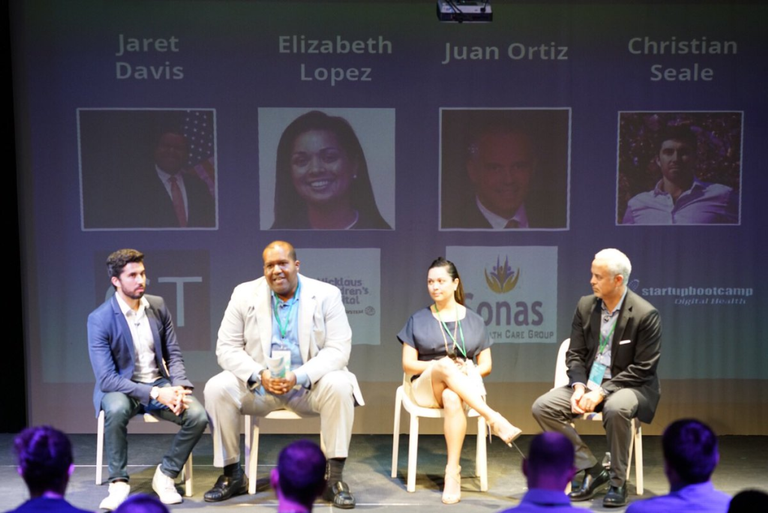 A panel discusses the future of digital health in South Florida at Startupbootcamp’s Demo Day. From left: Christian Seale of Startupbootcamp, Jaret Davis of Greenberg Traurig, Elizabeth Lopez of Miami Children’s Health System and Juan Ortiz of Sonas Home Health Care.